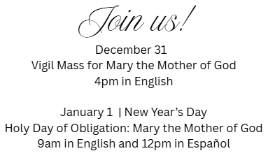 Dec 31 | Vigil Mass for Holy Day of Obligation: Mary the Holy Mother of God | Church, 4pm in English