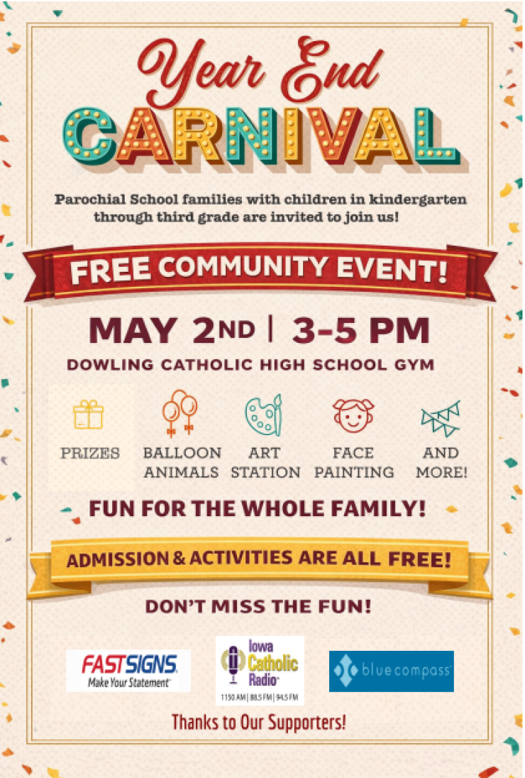 We are hosting our FREE Year-End Carnival for all Diocese families and parochial school students (Pre-K through 3rd grade). The event will include carnival games, popcorn, a prize walk, balloon twisting, face painting, and more—all at no cost to families.